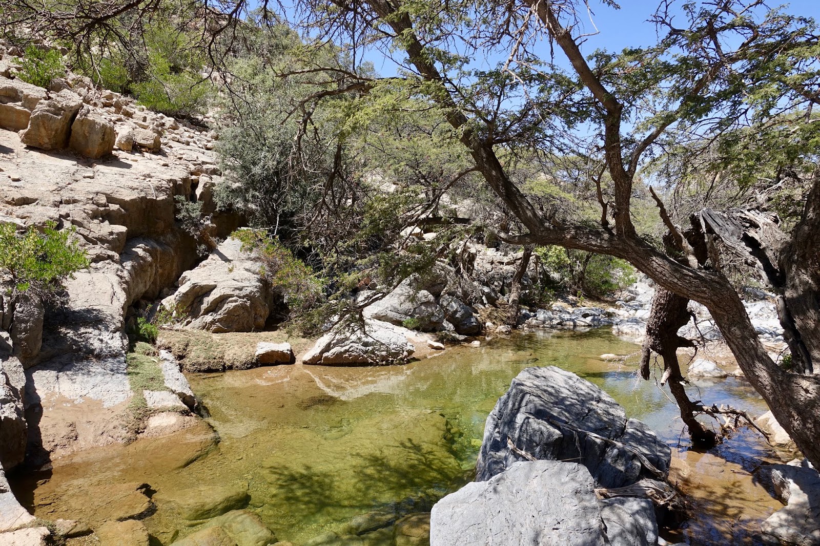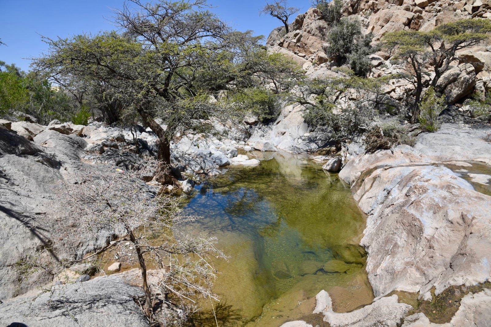 The start to the hike is across the road from Alila Jabal Akhdar’s gatehouse. After crossing a small wadi, you come to another one you follow for about an hour. While this wadi is generally dry, it was different in our case. Due to quite heavy rainfall a few days earlier, some pools were full.